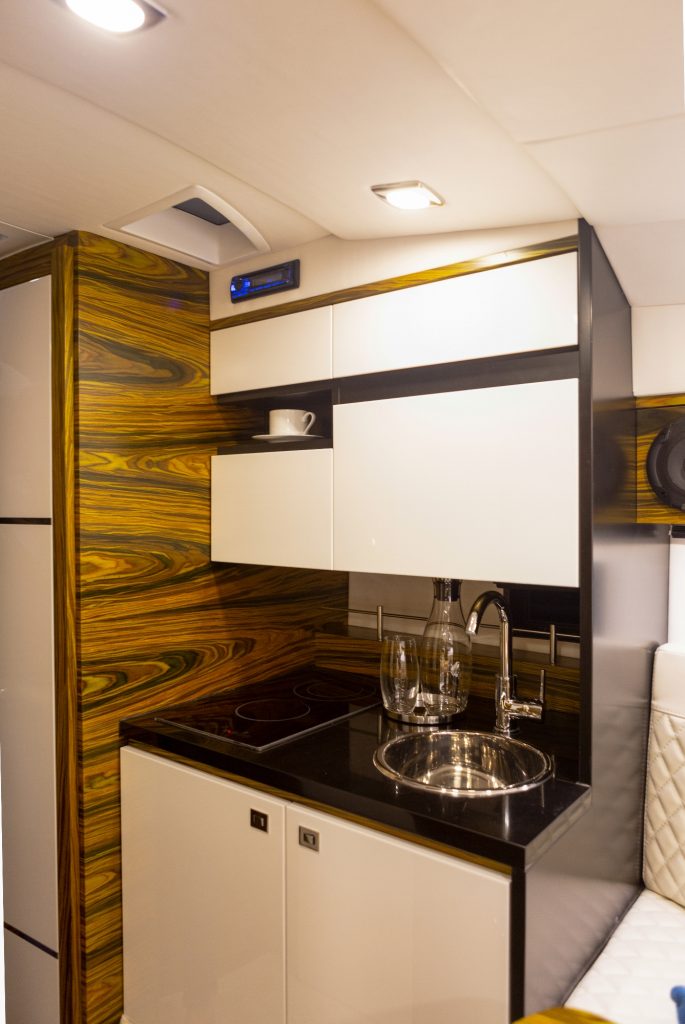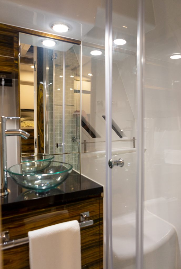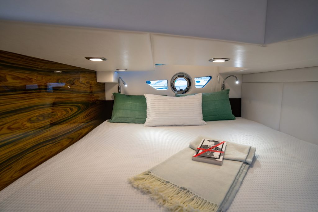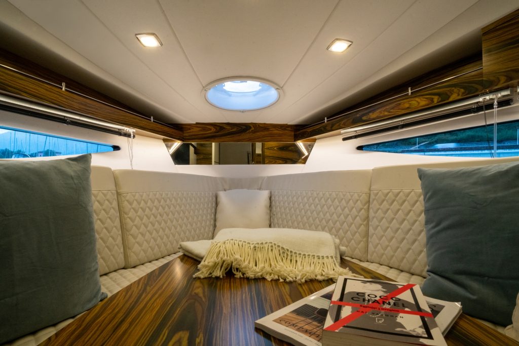 Die Innenausstattung ist sehr innovativ gestaltet und das Raumgefühl ist, wie es in einem Boot dieser Größe nicht erwartet wird. Ein längsausgerichtetes Doppelbett, mit Tageslicht von beiden Seiten, durch die großflächigen, im Rumpf integrierten Fenstern, wie auch die separate Dusche im Badezimmer und viele weitere Details, bieten höchsten Komfort auf diesem Boot.